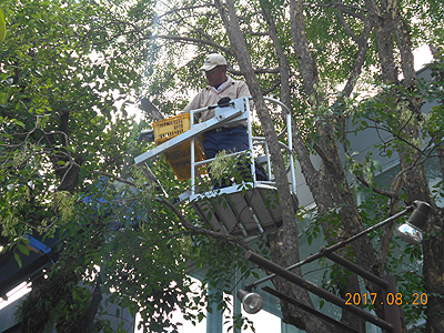 クレーン車を使い、高さのある街路樹の枝打ち作業をしました。