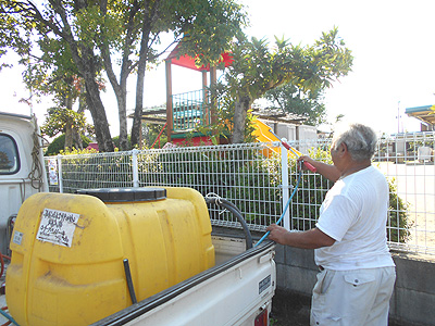 徐々に気温が上がり暑くなるなか、消毒液を散布し