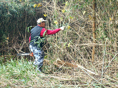 密集している竹林の伐採作業で、竹の切り倒しを