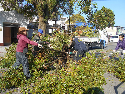 道路に覆い被さる楠の大木の枝打ち作業です。
