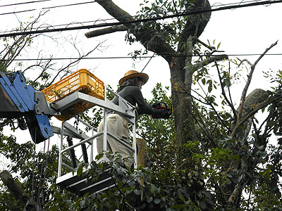 高所作業車での枝打と剪定が続きますが、天候は曇り空で比較的