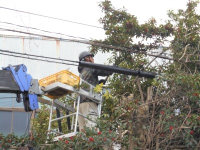 樹木が繁殖して周りの配電線に絡んで危険ということで