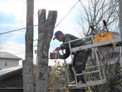 残りの枝や幹の分を作業車を使い上から作業している